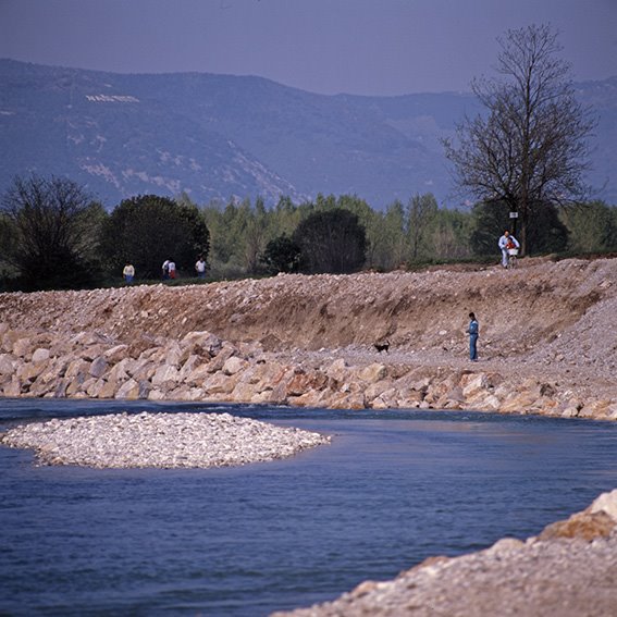 Fiume Isonzo con lavori di rinforzo degli argini nella frazione di Sant’Andrea/Štandrež nel comune di Gorizia; sul fondo il Monte Sabotino |