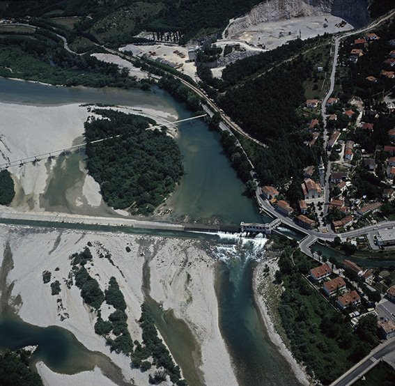 Veduta aerea del fiume Isonzo a Sagrado con la Rosta (o Presa sull’Isonzo), il canale De Dottori e la chiesa di San Nicolò |