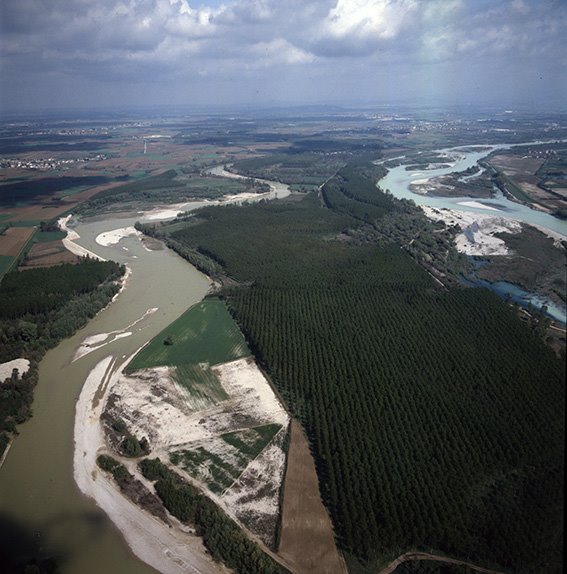 Veduta aerea dei fiumi Isonzo e Torre; in lontananza si vedono gli abitati di Ruda, Villesse e Romans d’Isonzo |