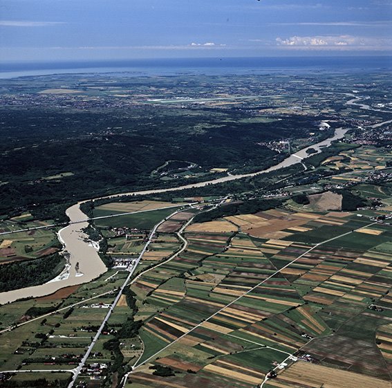 Veduta aerea del fiume Isonzo con lo stradone della Mainizza, il Monte San Michele e parte del Carso a Doberdò del Lago/Doberdob; sul fondo il mare |
