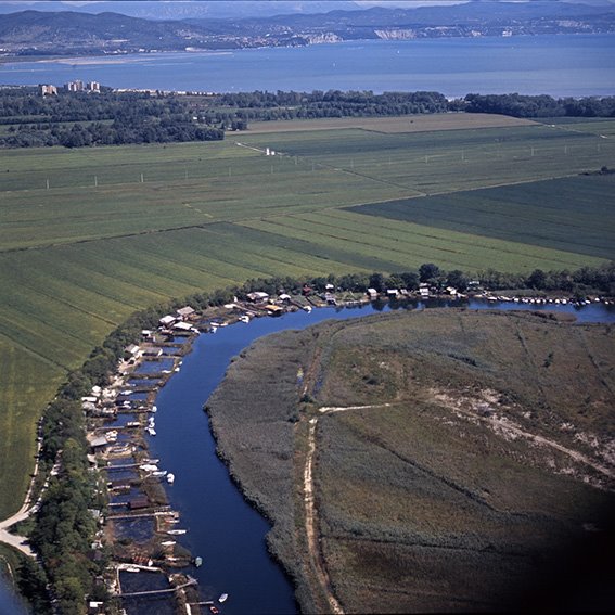 Veduta aerea del canale Quarantia in prossimità della foce dell’Isonzo; sullo sfondo Marina Julia e golfo di Panzano |