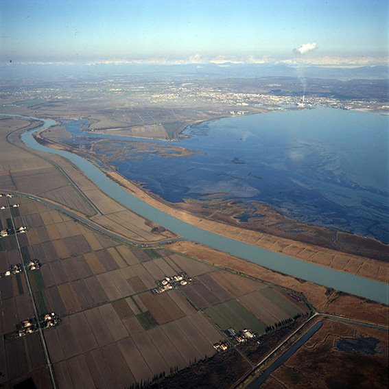 Veduta aerea del fiume Isonzo in prossimità della foce, l’Isonzato e il canale Quarantia; in fondo il golfo di Panzano e Monfalcone |