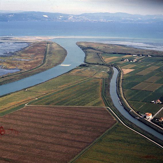 Veduta aerea del fiume Isonzo in prossimità della foce e l’Isonzato nella frazione di Fossalon nel comune di Grado |