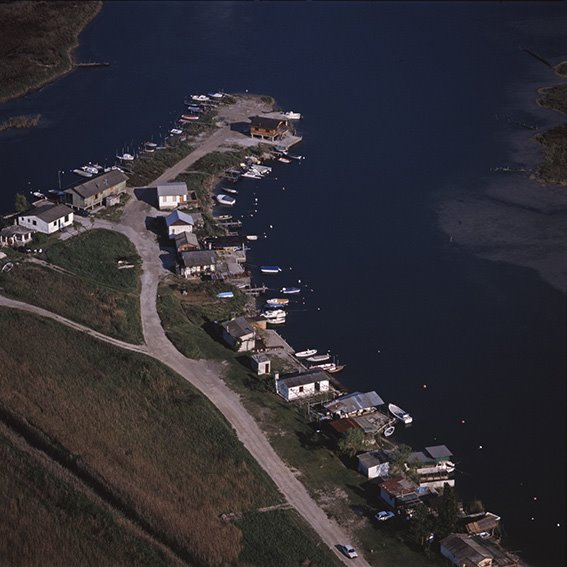 Veduta aerea del canale Quarantia con i “casoni” in prossimità della foce dell’Isonzo |