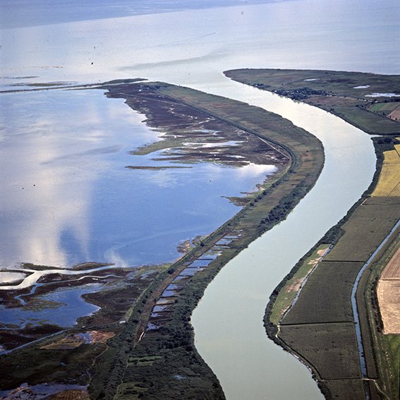 Veduta aerea del fiume Isonzo in prossimità della foce con la frazione di Villaggio Punta Sdobba nel comune di Grado |