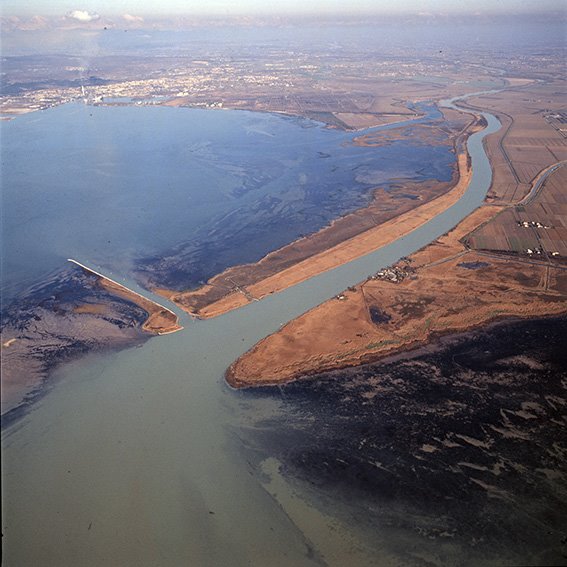 Veduta aerea del fiume Isonzo in prossimità della foce, l’Isonzato, la frazione di Villaggio Punta Sdobba nel comune di Grado e il golfo di Panzano; sul fondo Monfalcone |