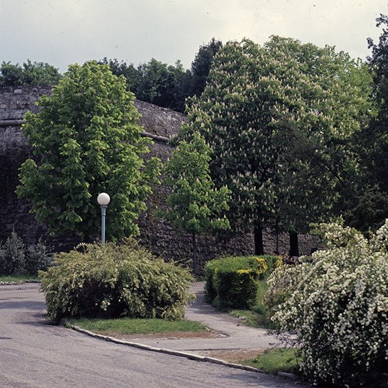 Viale D’Annunzio con una parte della cinta a bastioni del Castello |