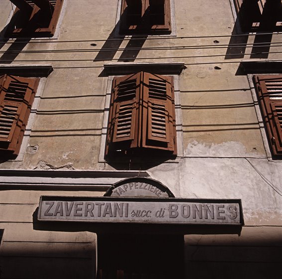 Particolare di una casa con insegna d’epoca della tappezzeria Zavertani, in via del Seminario nel quartiere Montesanto-Piazzutta |