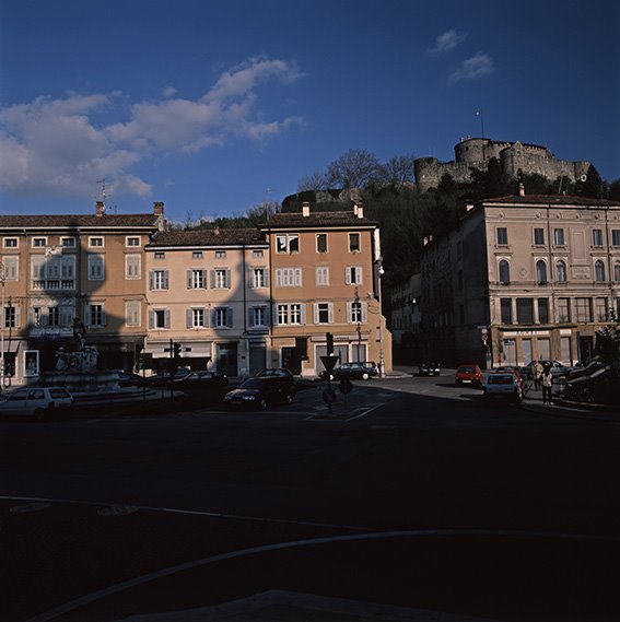 Piazza della Vittoria con la fontana del Nettuno, il Palazzo Paternolli-Bombi, il Castello e via Bombi |