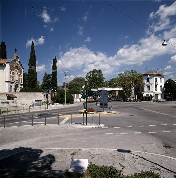 Piazzale Saba, corso Italia e la chiesa dei Santi Giovanni di Dio e Giusto nel Centro Cittadino a sud |