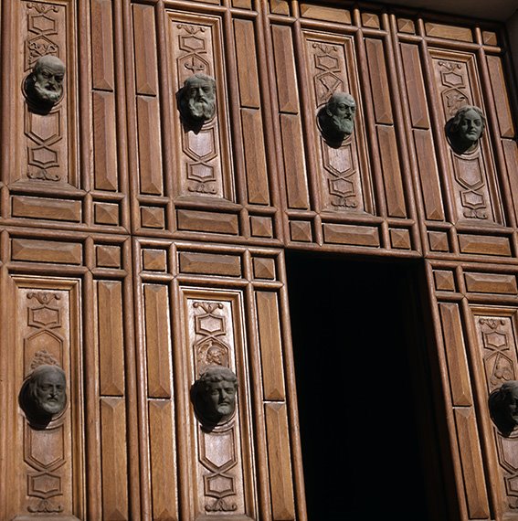 Portale centrale della chiesa metropolitana dei Santi Ilario e Taziano (Duomo) con le teste degli Apostoli |