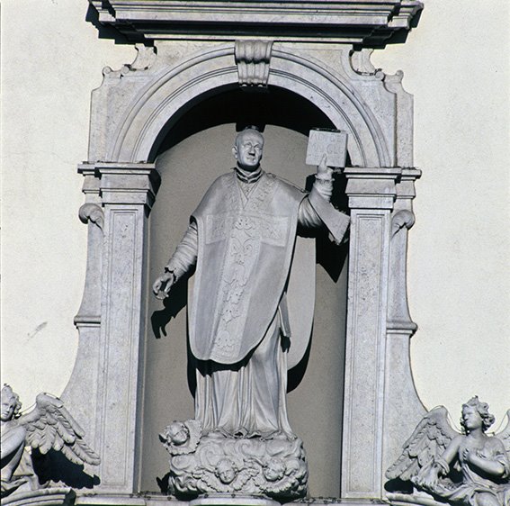 Statua di Sant’Ignazio posta sulla facciata della chiesa di Sant’Ignazio sopra il portale principale |