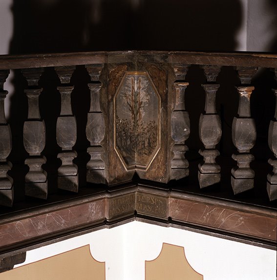Interno della chiesa di Sant’Ignazio: particolare dipinto di una balaustra lignea nella sala del ‘700 |