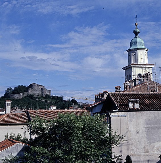 Veduta del quartiere Montesanto-Piazzutta con il campanile della chiesa dei Santi Vito e Modesto; sullo sfondo il Castello di Gorizia |