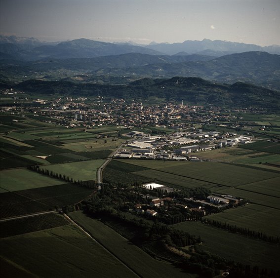 Veduta aerea del Collio cormonese in località Angoris; Villa Locatelli (Tenuta di Angoris) e la zona industriale artigianale di Cormòns; sullo sfondo la cittadina di Cormòns, il Monte Quarin e le Prealpi Giulie |