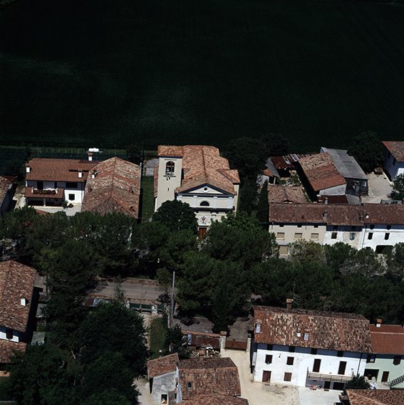 Veduta aerea della frazione di Borgnano nel comune di Cormòns con la chiesa di Santa Fosca |