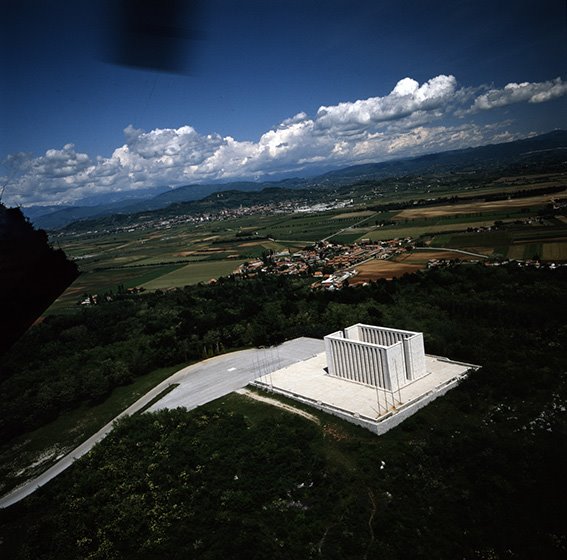 Veduta aerea del colle di Medea con l’Ara Pacis Mundi e la frazione di Borgnano nel comune di Cormòns; sullo sfondo la cittadina di Cormòns e il Monte Quarin |