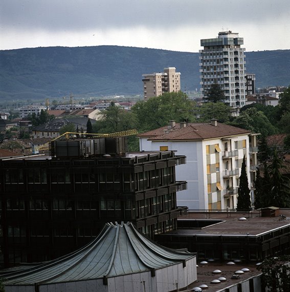 Parte del Palazzo della Regione nel Centro Cittadino. In fondo condomini multipiano nel quartiere di Borgo San Rocco e il Carso |