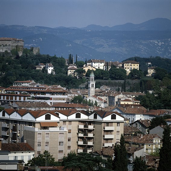 Palazzo Attems-Santa Croce (Comune) e la chiesa metropolitana dei Santi Ilario e Taziano (Duomo) nel Centro Cittadino. In fondo il Centro Cittadino (Borgo Castello) con il Castello di Gorizia e l’altopiano di Tarnova |
