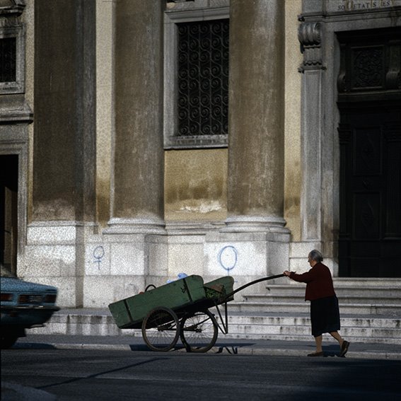 Centro cittadino: persona anziana con la “burella” in piazza della Vittoria; sullo sfondo chiesa di Sant’Ignazio |