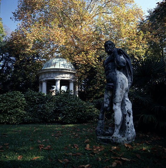 Parco del Municipio nel Centro Cittadino con la statua di Ercole in primo piano; sullo sfondo il tempietto neoclassico |
