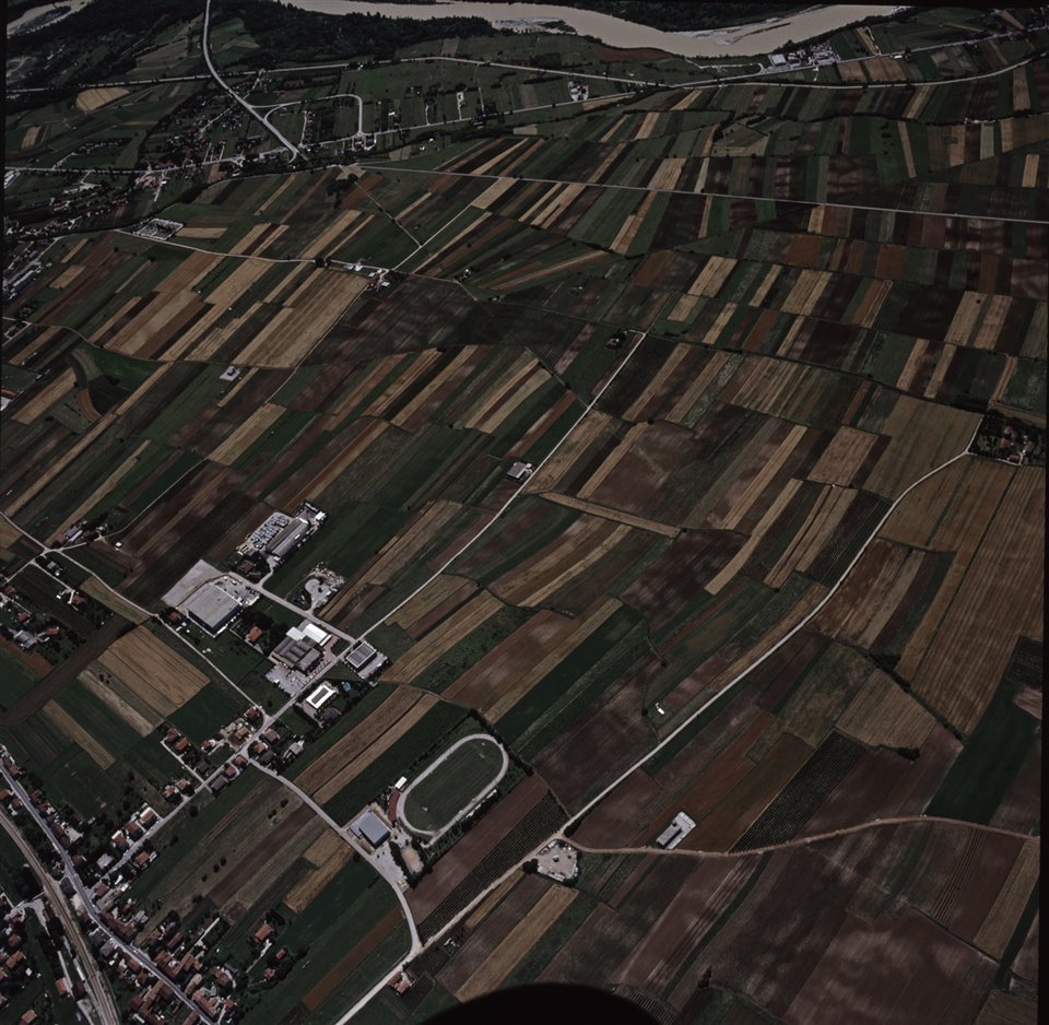 Veduta aerea di campi coltivati tra il comune di Mossa e il fiume Isonzo; in basso a sinistra parte dell’abitato di Mossa. In alto il canale irriguo lungo la destra Isonzo e lo stradone della Mainizza |