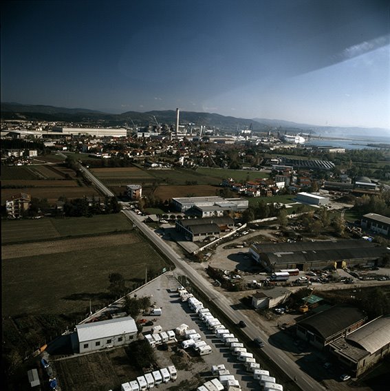 Veduta aerea della zona industriale di Monfalcone con lo stabilimento Fincantieri – Cantiere Navale di Monfalcone e la centrale elettrica Endesa (ora A2A). In fondo il Carso |