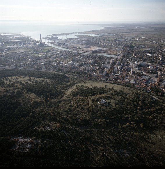 Veduta aerea del colle della Rocca e della città di Monfalcone, con l’area del porto, il canale Valentinis, lo stabilimento Fincantieri – Cantiere Navale di Monfalcone. Sullo sfondo il golfo di Panzano |