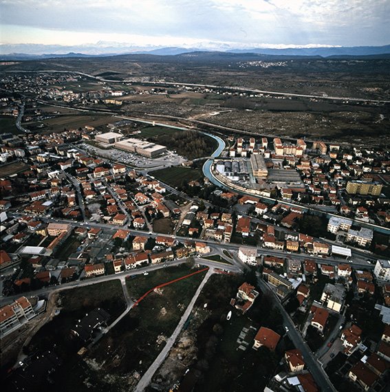 Veduta aerea del quartiere San Polo a Monfalcone con al centro l’ospedale di Monfalcone (San Polo) e il canale De Dottori; in fondo il Carso |