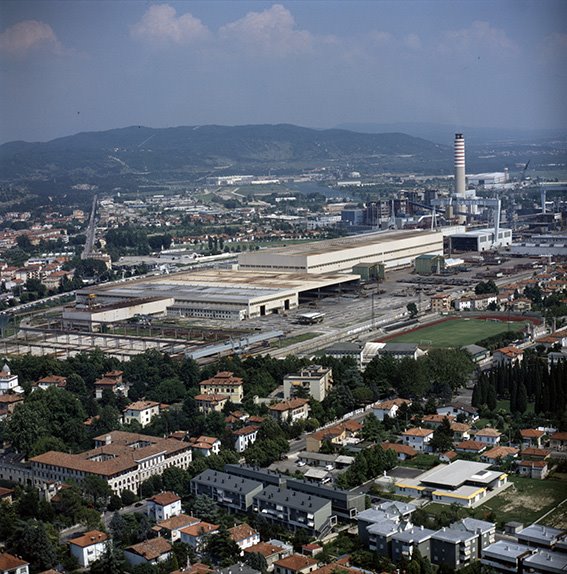 Veduta aerea di parte del quartiere di Panzano con lo stabilimento Fincantieri – Cantiere Navale di Monfalcone e il campo sportivo I.t.c. Sullo sfondo il Carso |