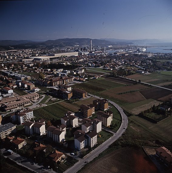 Veduta aerea di parte della città di Monfalcone con lo stabilimento Fincantieri – Cantiere Navale di Monfalcone e la centrale elettrica Endesa (ora A2A). In fondo il Carso |