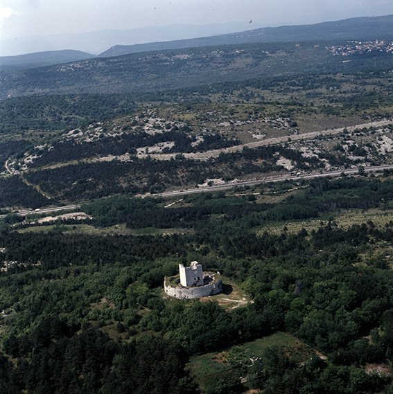 Veduta aerea della Rocca di Monfalcone e un tratto dell’autostrada A4 Venezia-Trieste |