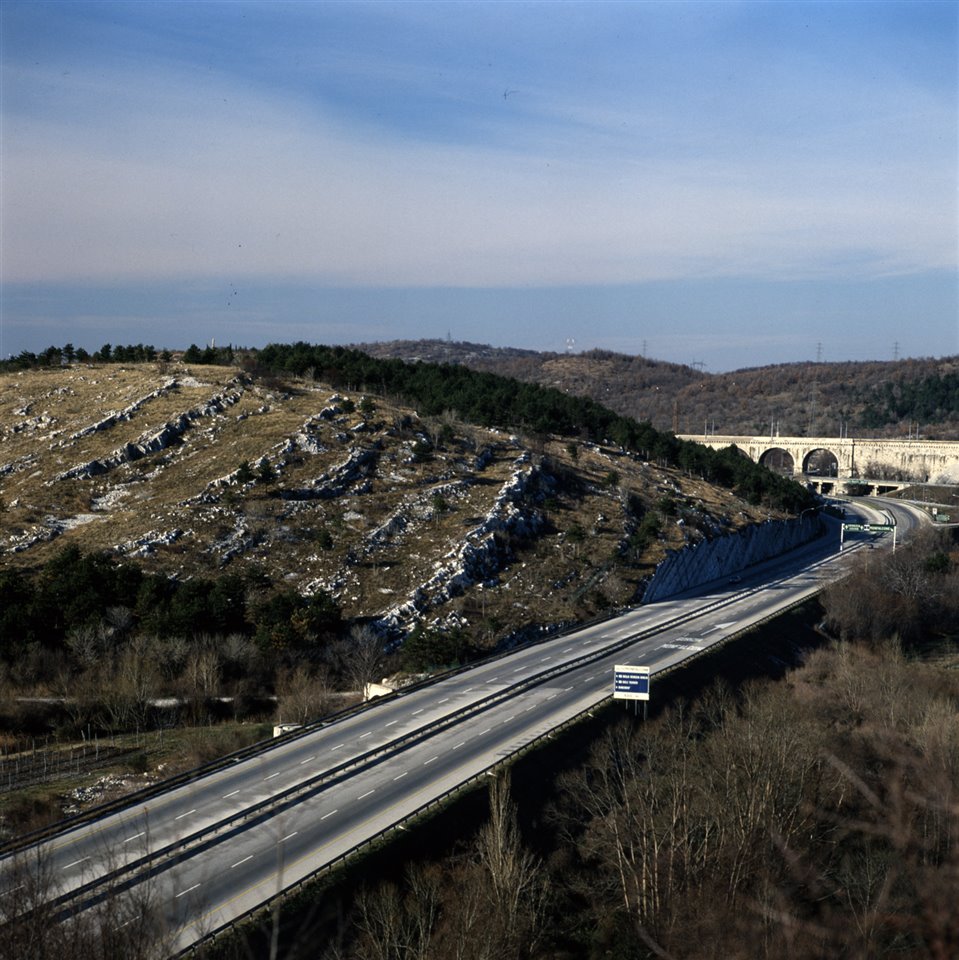 Veduta aerea dell’autostrada A4 Venezia-Trieste nella zona del Lisert. In fondo il ponte ferroviario e il Carso |