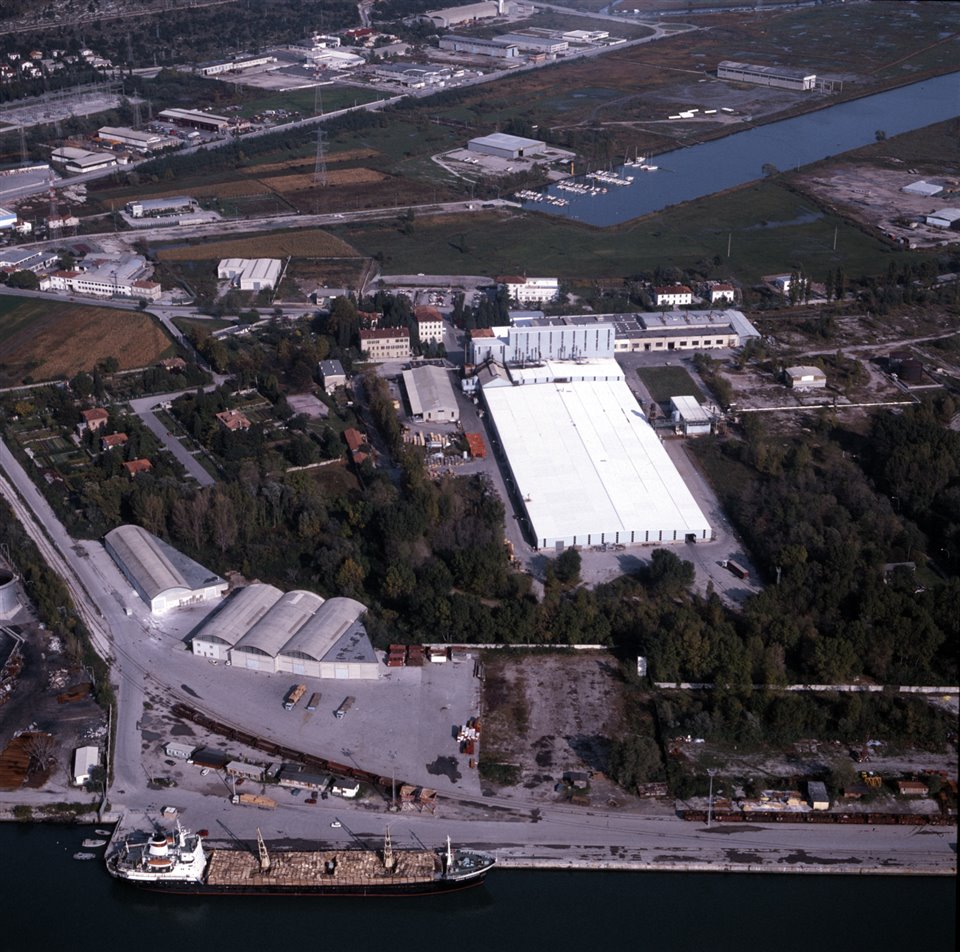 Veduta aerea del porto di Monfalcone e capannoni industriali |