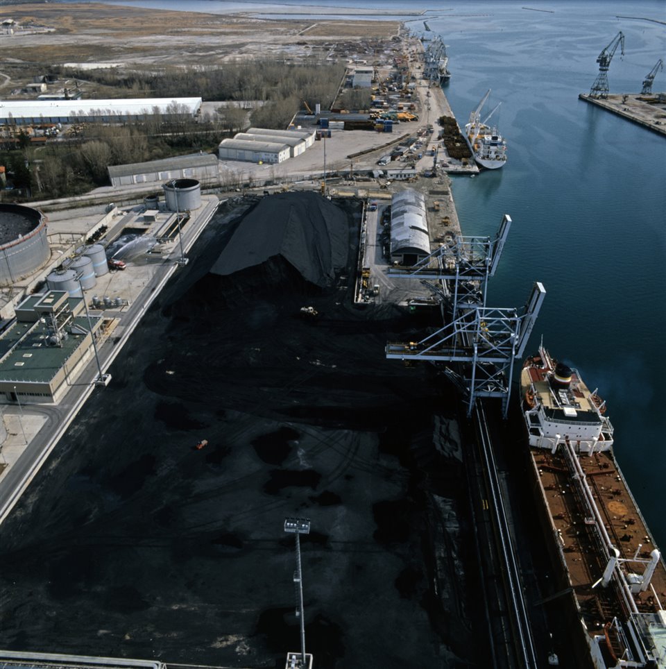 Veduta aerea di parte della centrale elettrica Endesa (ora A2A) e del porto di Monfalcone |