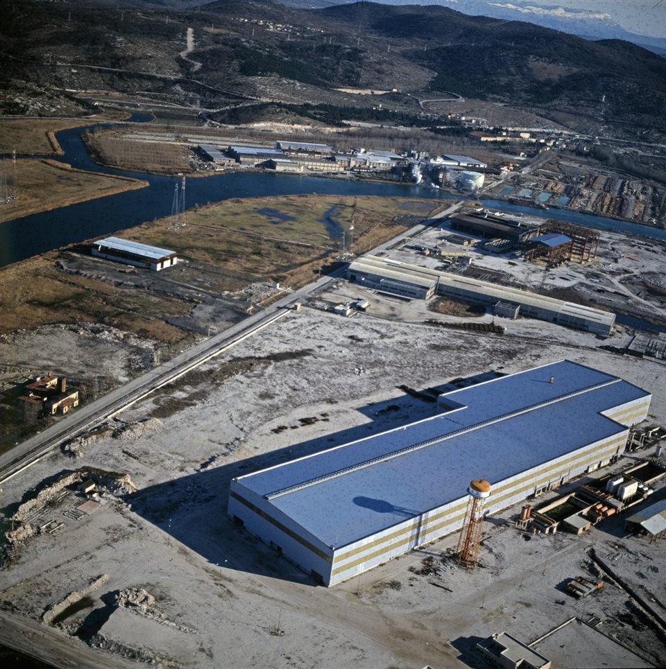 Veduta aerea di parte della zona industriale del Lisert con le Terme Romane in basso a sinistra. Al centro il canale di Sablici, la cartiera Burgo e il Carso |