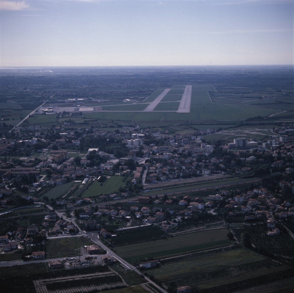 Veduta aerea di parte dell’abitato di Ronchi dei Legionari e dell’aeroporto “Pietro Savorgnan di Brazzà” (ex aeroporto del Friuli-Venezia Giulia) |