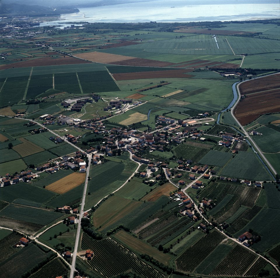 Veduta aerea dell’abitato di San Canzian d'Isonzo; sullo sfondo il golfo di Panzano |