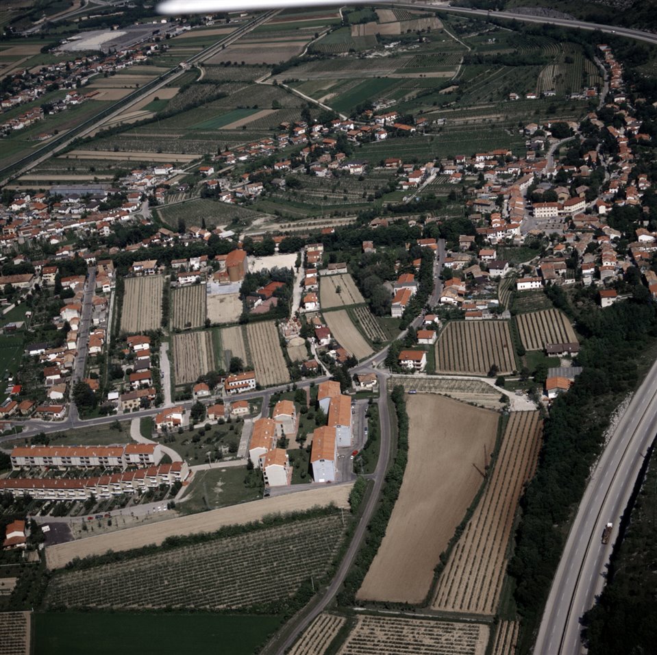 Veduta aerea della frazione di Vermegliano nel comune di Ronchi dei Legionari e di un tratto dell’autostrada A4 Venezia-Trieste |