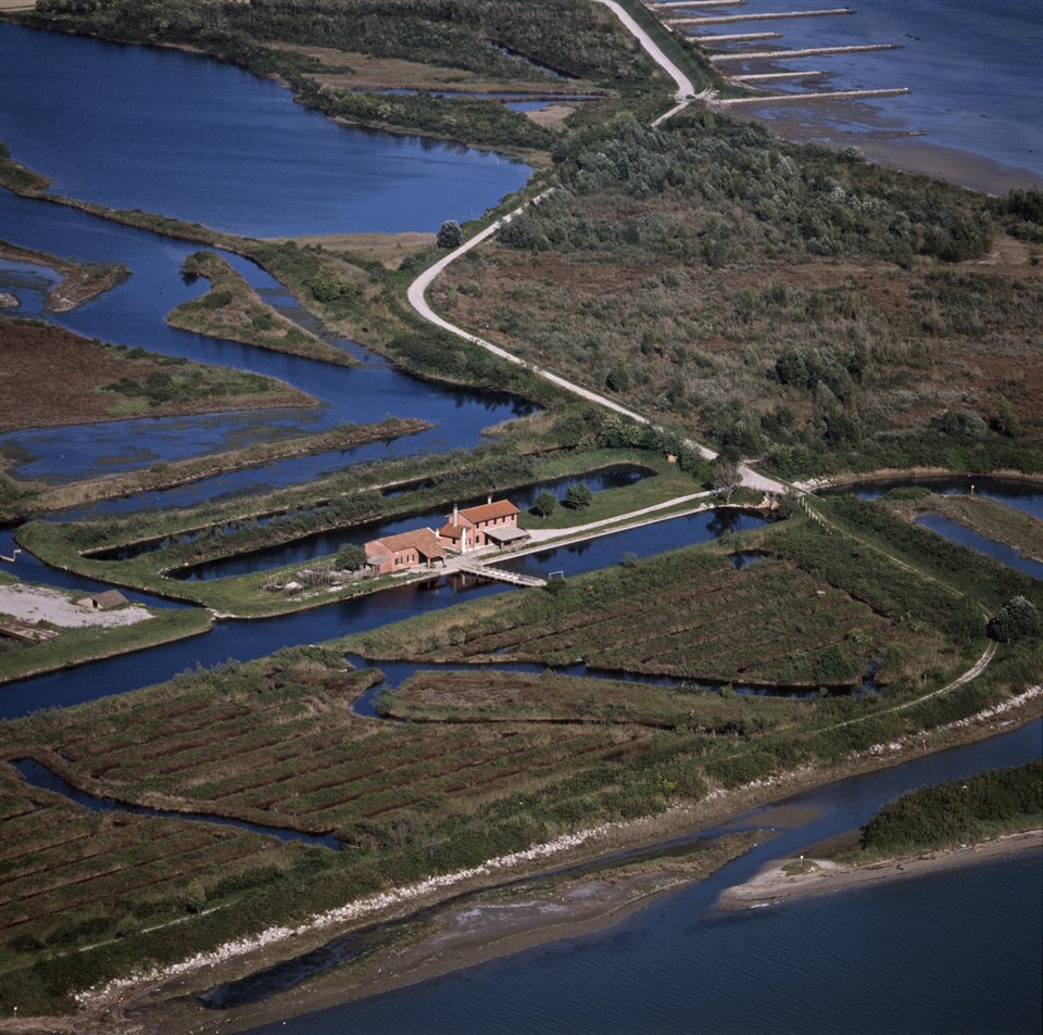 Veduta aerea di un tratto del canale Primero; al centro il centro visite Riserva Naturale Valle Cavanata e un tratto del canale di Averto |