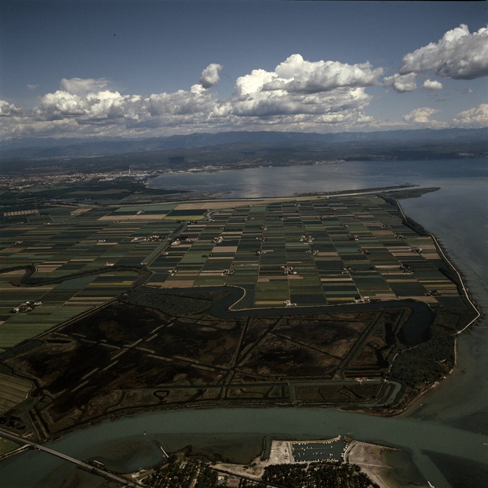 Veduta aerea del tratto terminale del canale Primero con un tratto della strada provinciale 19 e la Marina Primero. Al centro un tratto del canale di Averto, la frazione di Fossalon nel comune di Grado e la foce del fiume Isonzo; in fondo il golfo di Panzano, la città di Monfalcone ed il Carso |