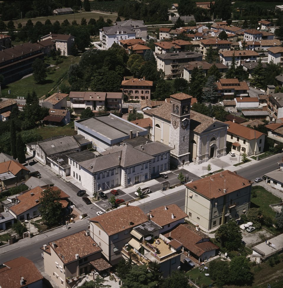 Veduta aerea di parte dell’abitato di Fogliano-Redipuglia con la chiesa di Santa Elisabetta e un tratto della strada regionale 305 |