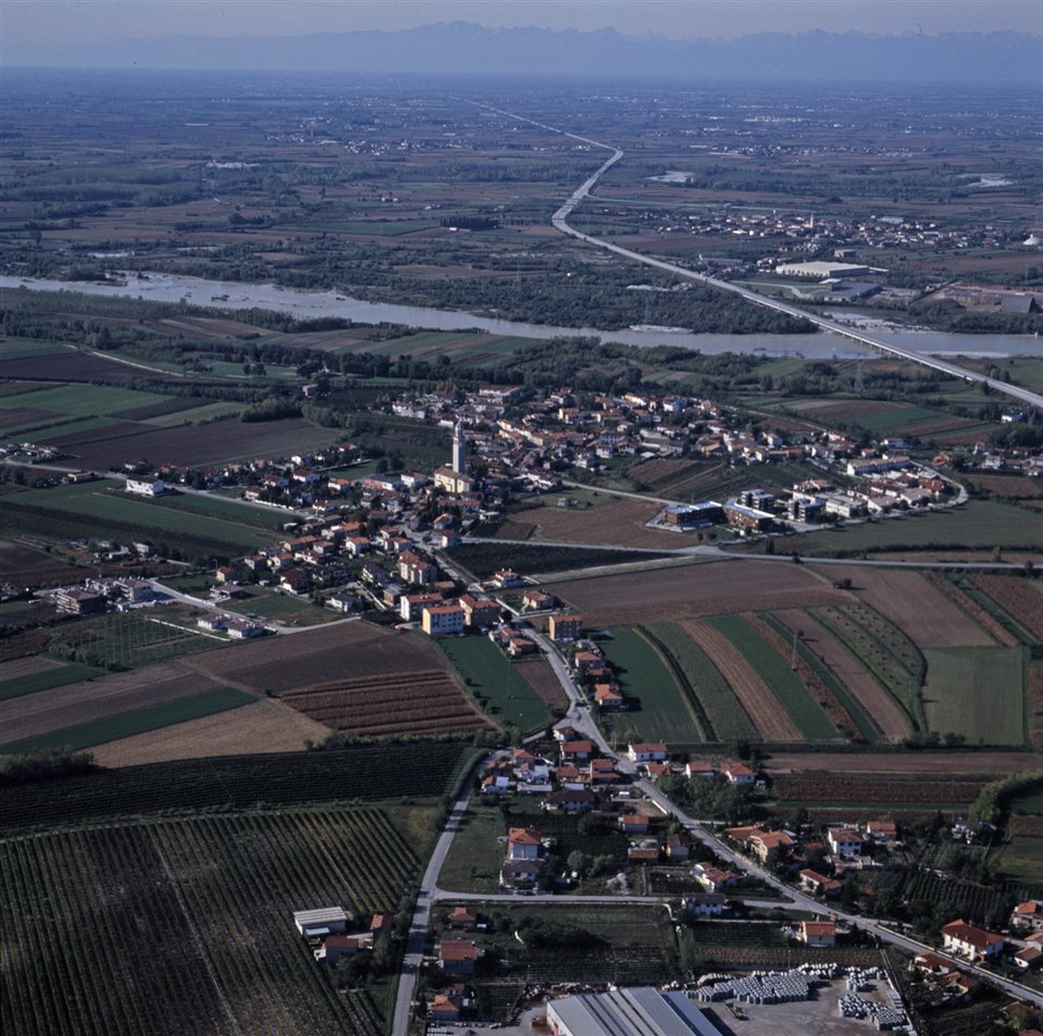 Veduta aerea dell’abitato di San Pier d'Isonzo. Al centro il fiume Isonzo, un tratto dell’autostrada A4 Venezia-Trieste con il ponte dell’autostrada Venezia-Trieste e il paese di Villesse; sullo sfondo le Prealpi Carniche |