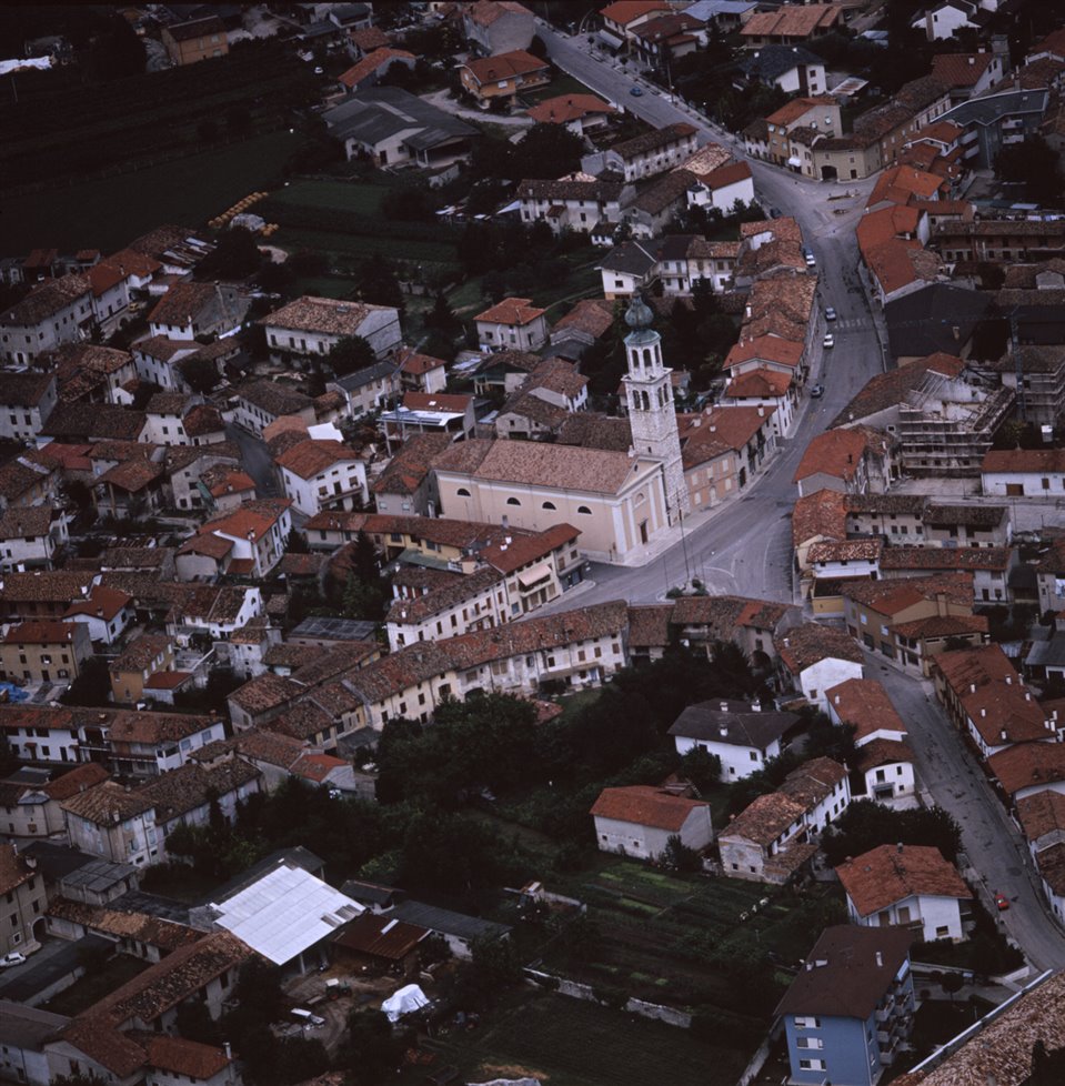 Veduta aerea di parte dell’abitato di Villesse con la chiesa di San Rocco |