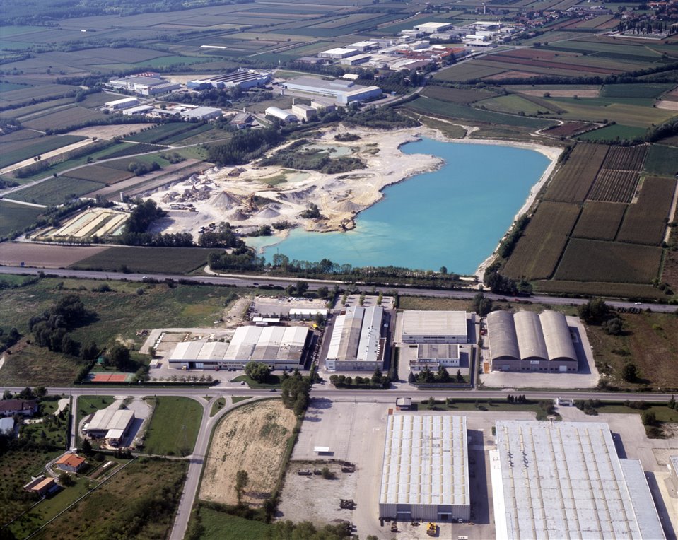 Veduta aerea di capannoni industriali nel territorio di Villesse con la cava Tomasin S.r.l. e un tratto dell’autostrada A34 Villesse-Gorizia |