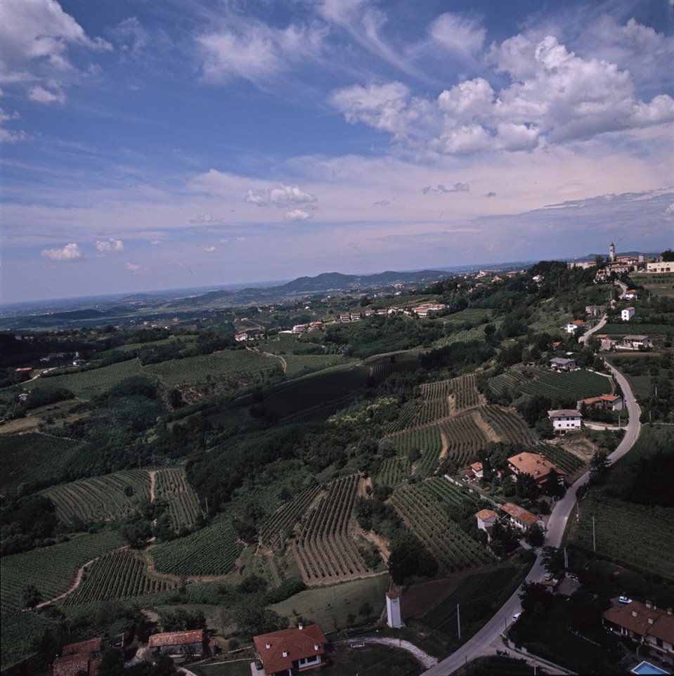 Veduta aerea di parte del Collio con l’abitato di San Floriano del Collio; in primo piano via Scedina |