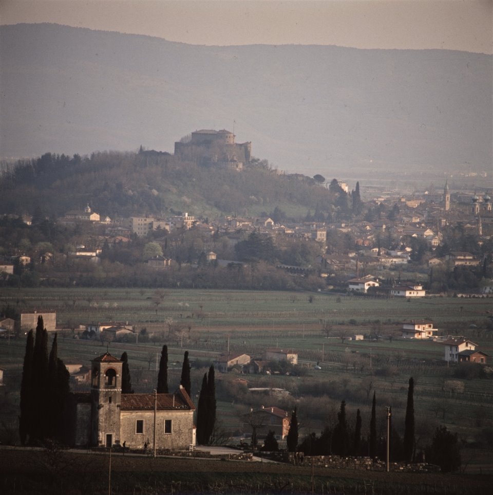 La chiesa di San Mauro e il Castello di Gorizia. In fondo il Carso |