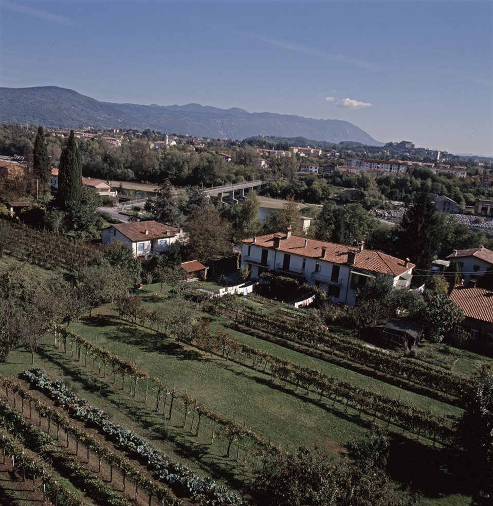 Un tratto del fiume Isonzo con la passerella di Straccis, la città di Gorizia e il Castello di Gorizia. Sullo sfondo il Monte San Gabriele e l’altopiano di Tarnova |