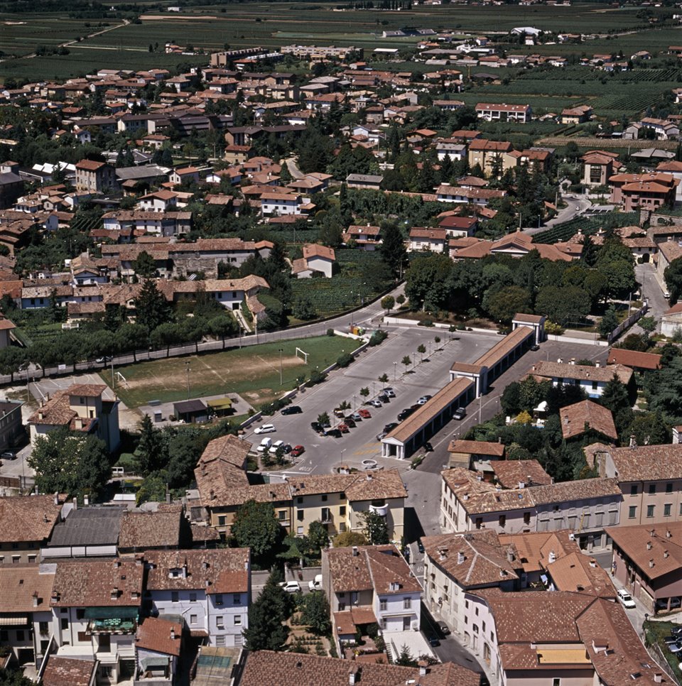 Veduta aerea di parte dell’abitato di Cormòns con via Cancelleria Vecchia e il parcheggio |