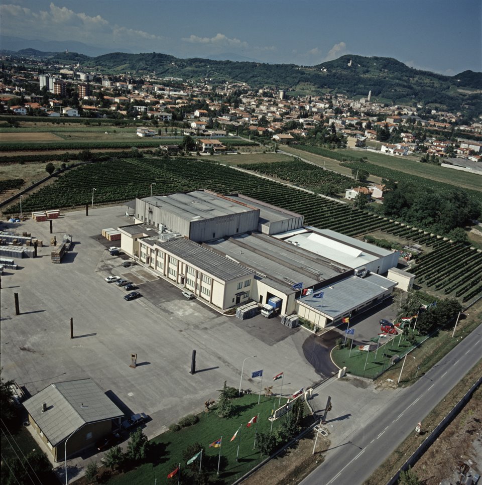 Veduta aerea della Cantina Produttori Cormòns; sullo sfondo l’abitato di Cormòns con il Monte Quarin |